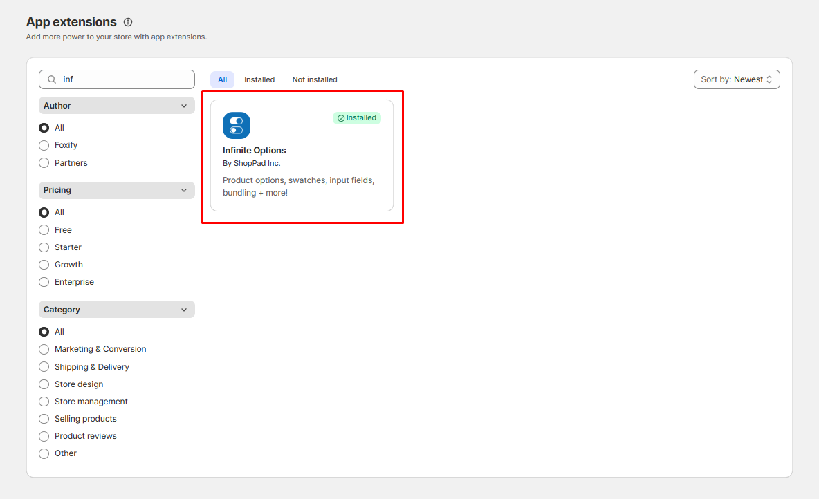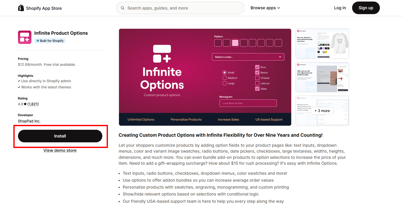 2. Find the **Infinite Product Options** app and click **Install**.
