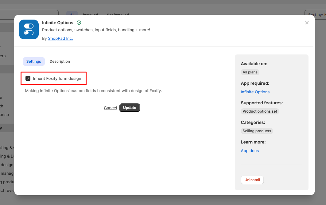 3. Open **Infinite Options settings** and check the box **Inherit Foxify form design** to ensure the custom fields match Foxify’s design.