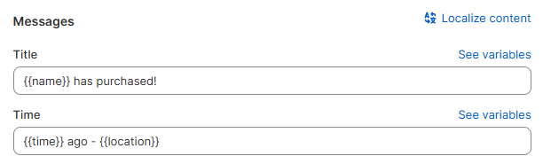 Variables like `{{name}}, {{location}},` `{{time}}, etc.` will automatically populate based on order data.