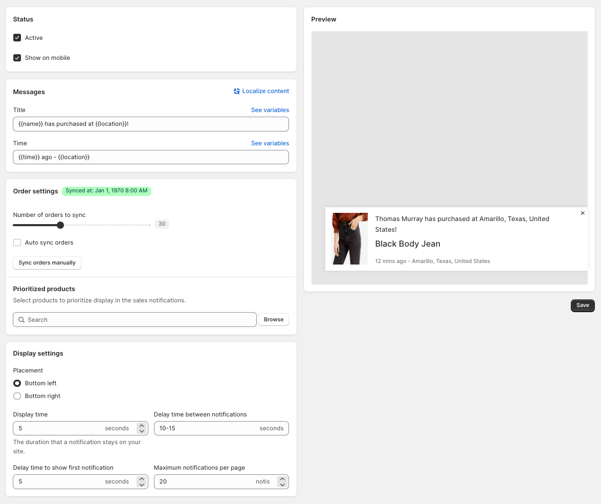 **Enable/ disable** the status of the sales notification by checking/ unchecking the **Active** box. You can decide whether to show them on mobile or not.