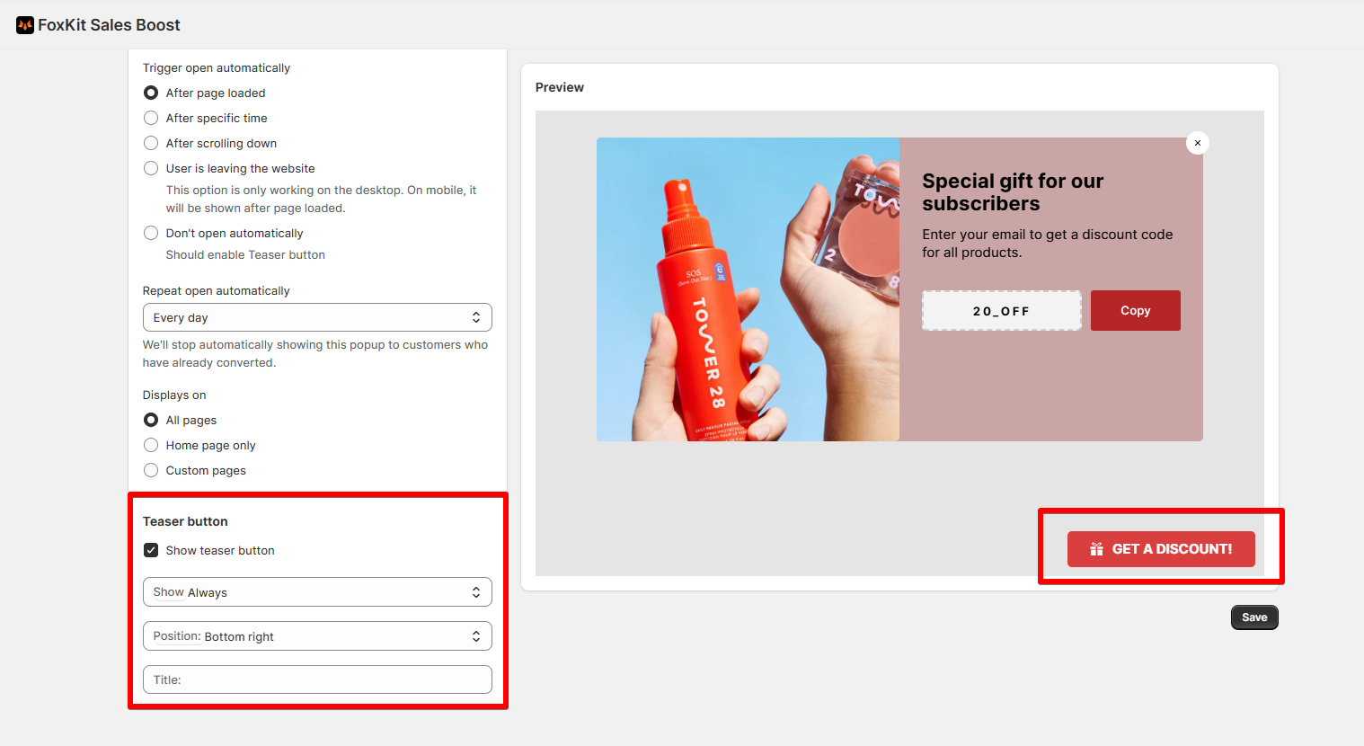 * **Show teaser button** to let customer open the popup again anytime they want.