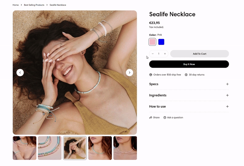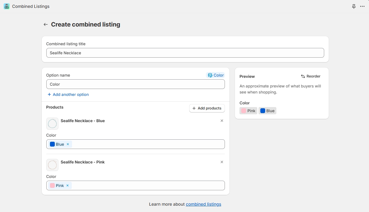 For example: We have a necklace item that comes with two color variants, and you have each of the colors as a separate product, then you can create a combined listing that displays those two products on the same product page.