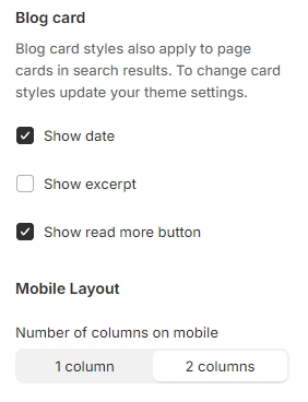 You can also enable/disable displaying the Blog card's elements if needed and choose the Mobile Layout.