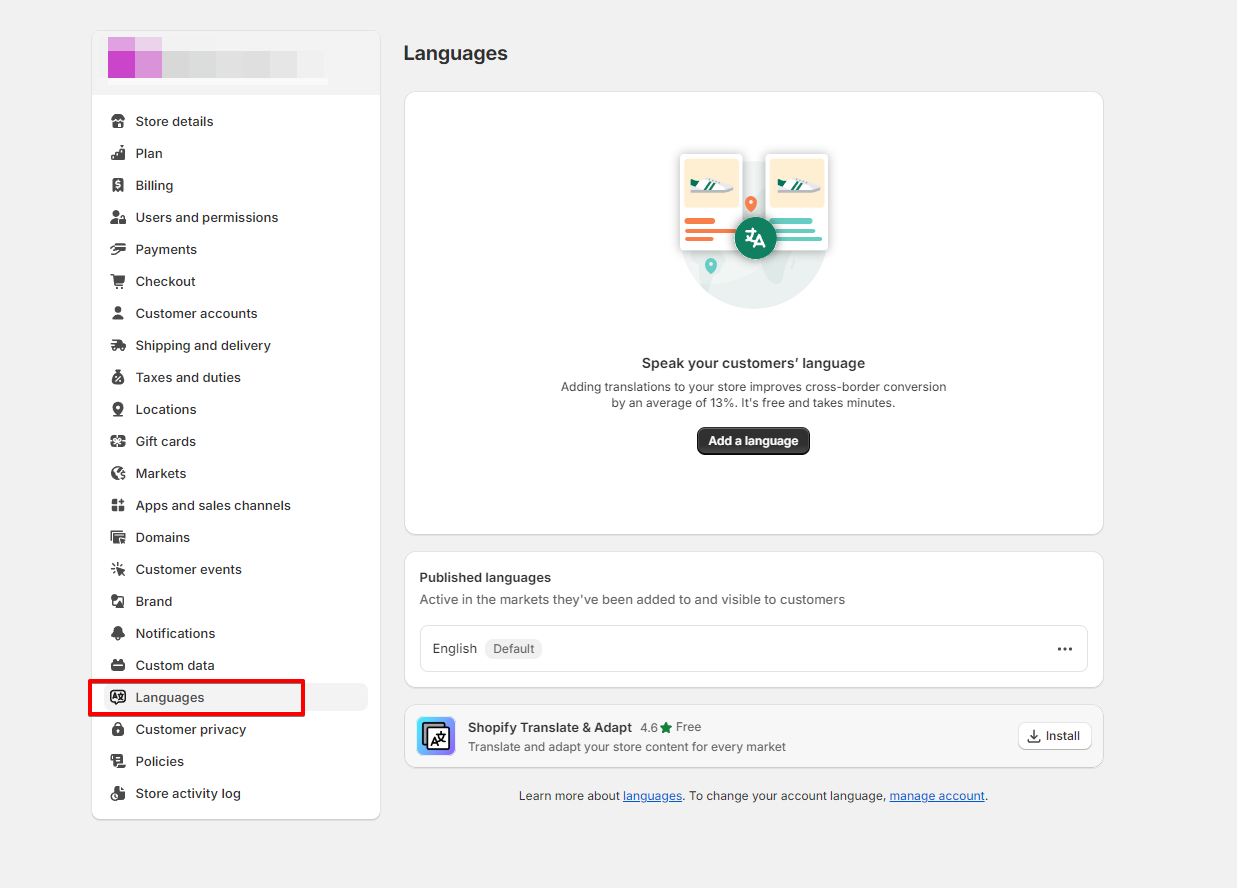 Step 2: To add more languages to your store, choose Languages > Add languages.