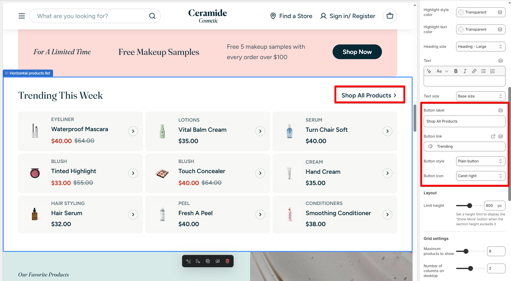 * **Button label:** Set a call-to-action label like "Shop All Brands".