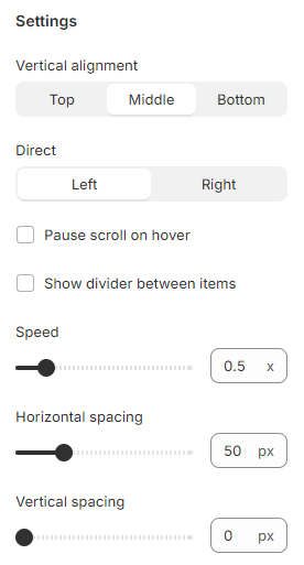 This is where you can update scroll direction, pause scroll on hover, and adjust scroll speed, item gap on desktop, and item gap on mobile.