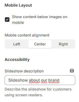 The section also lets you fill in the slideshow description for customers using screen readers.