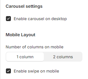 Set the number of columns on mobile (1-2 columns) or make them swipable by selecting :white\_check\_mark: Enable swipe on mobile