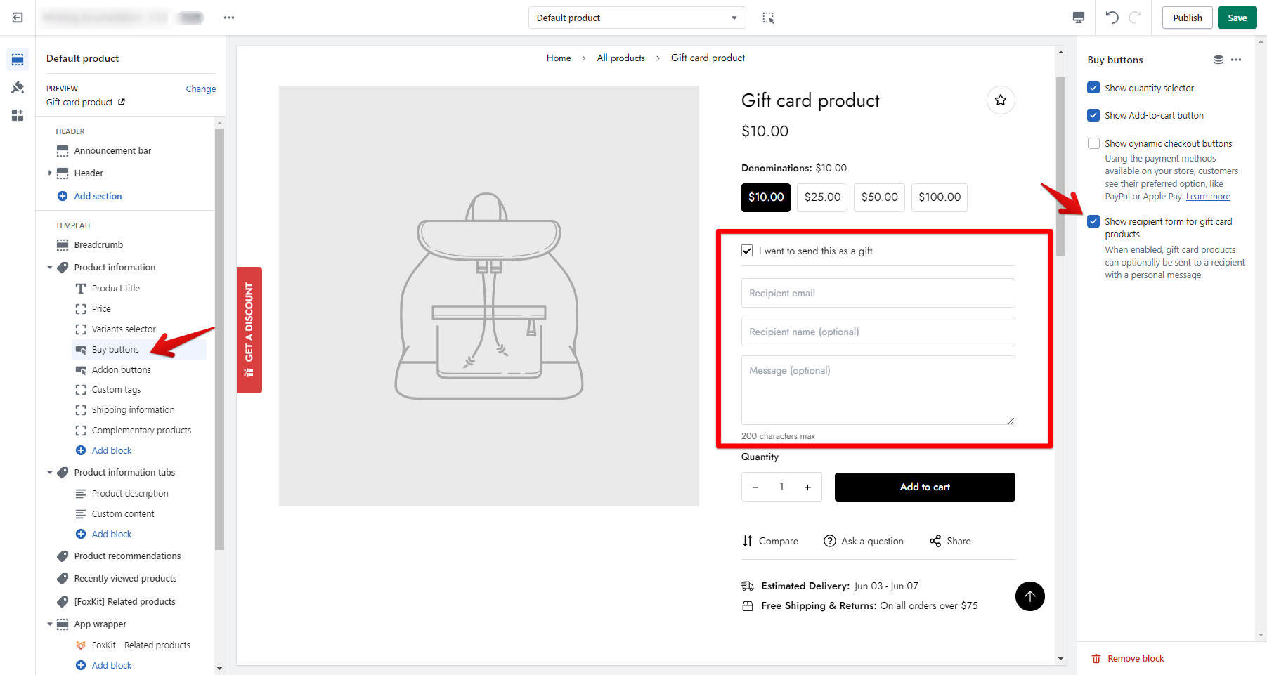 6. Click the checkbox **Show recipient information form for gift card products**.