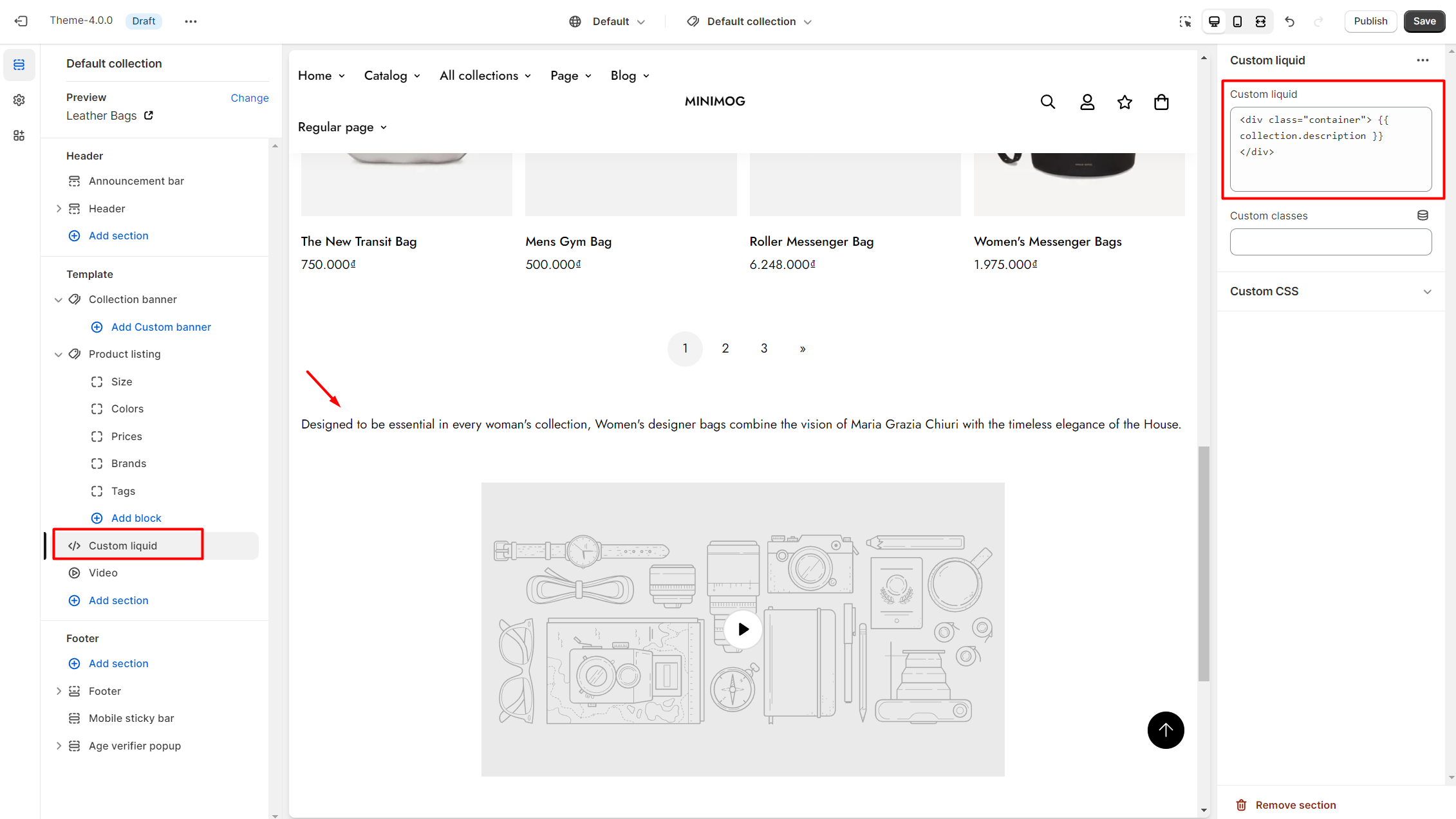 Click on the Custom Liquid section. Next, you add the following code to the Custom Liquid box in the setting panel: