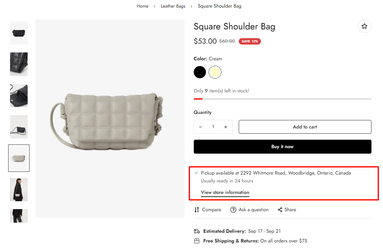 If you have local pickup enabled for more than one location, then the pickup availability section displays the location and pickup availability for one of your stores. Customers can click Check availability at other stores to check the product's availability at all of your locations that have pickup enabled.