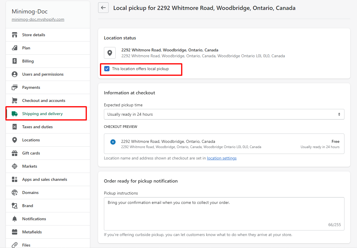 Under Order ready for pickup notification, enter pickup instructions for customers (Optional).