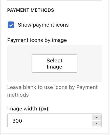 Enable/disable showing payment icons by ticking/unticking the checkbox. You can use payment icons by image or leave the option blank to show the original payment icons.