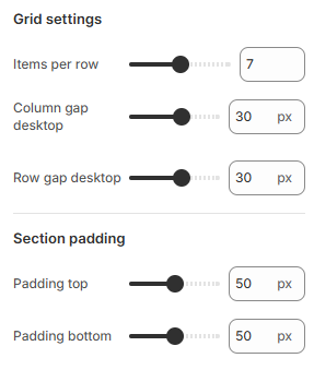 This section outlines the available layout controls for managing grid display and spacing within a content section of your Shopify store.<br>