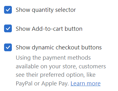 Enable/disable the "Show dynamic checkout button" to include a direct-to-checkout button. Other buttons such as Add-to-cart or quantity selector can be displayed if needed.