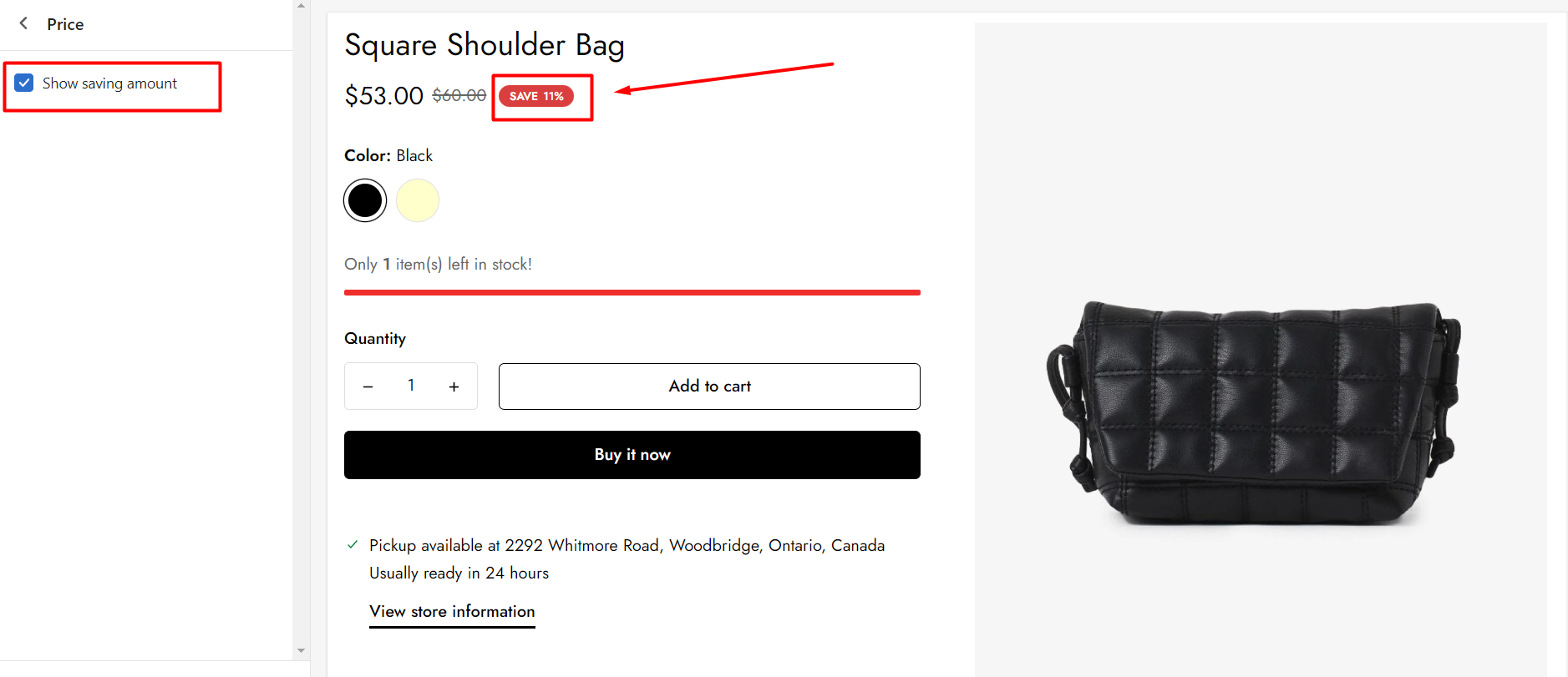 The product information blocks: title, price, and variants selector will be pulled from the product page to display in this section with a buy button. You can also add other blocks presenting different information for your featured product. Drag and drop to reorder the blocks.