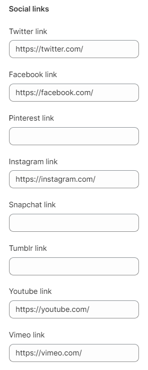 Social links can be added including: Twitter, Facebook, Pinterest, Instagram, Snapchat, Tumblr, YouTube, Vimeo, TikTok, Whatsapp, Spotify, LinkedIn, and Line.