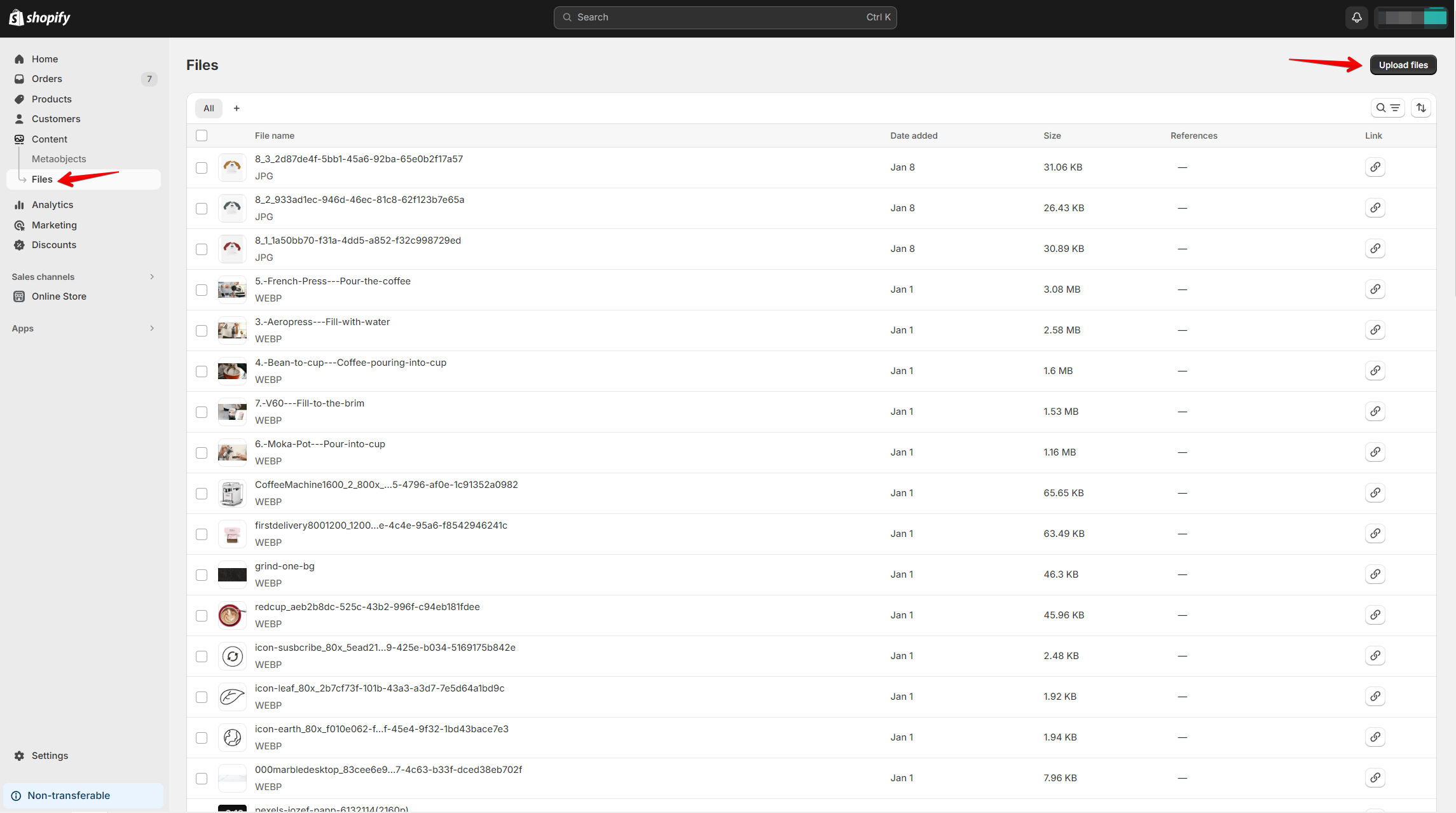 1. Go to **Shopify admin** > **Content** > **Files.**