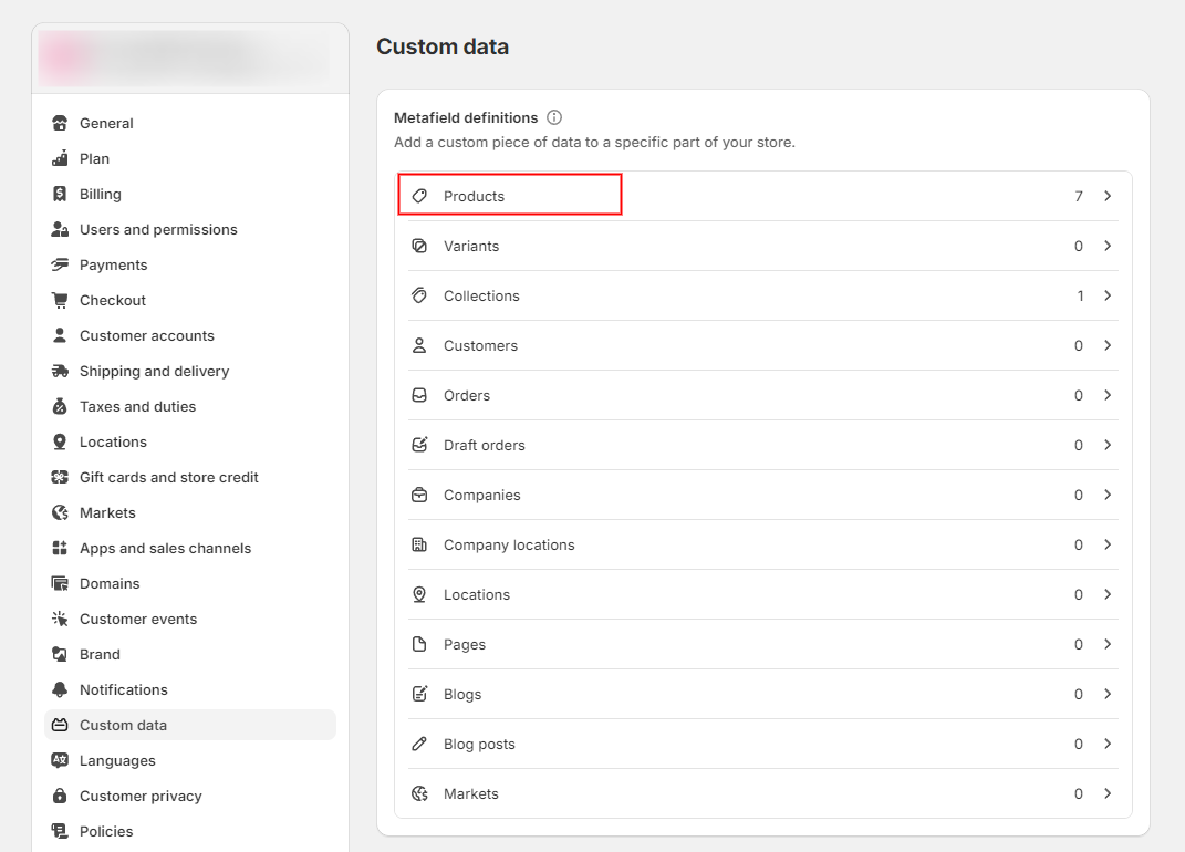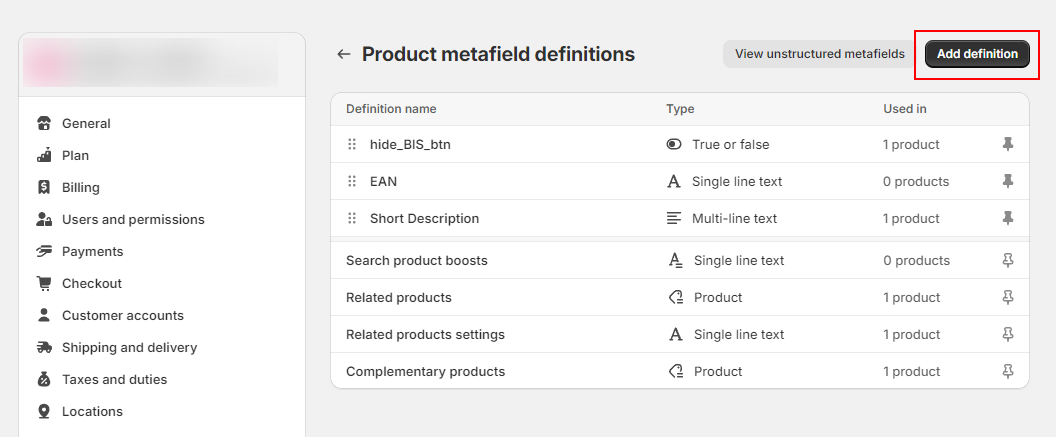 1. Go to **Settings** > **Custom data** > In the **Metafield definitions** field, select **Products** > Click **Add definition.**