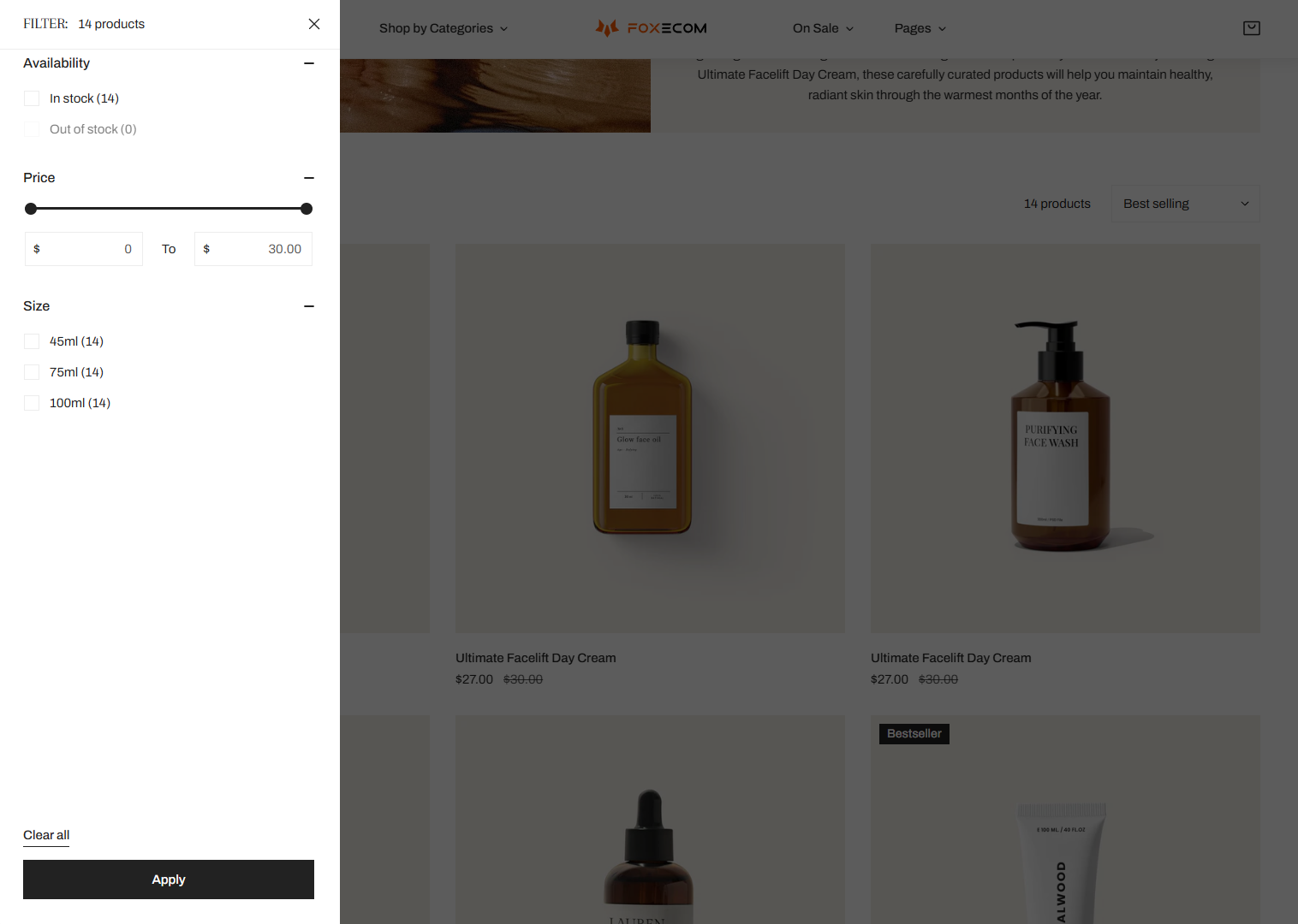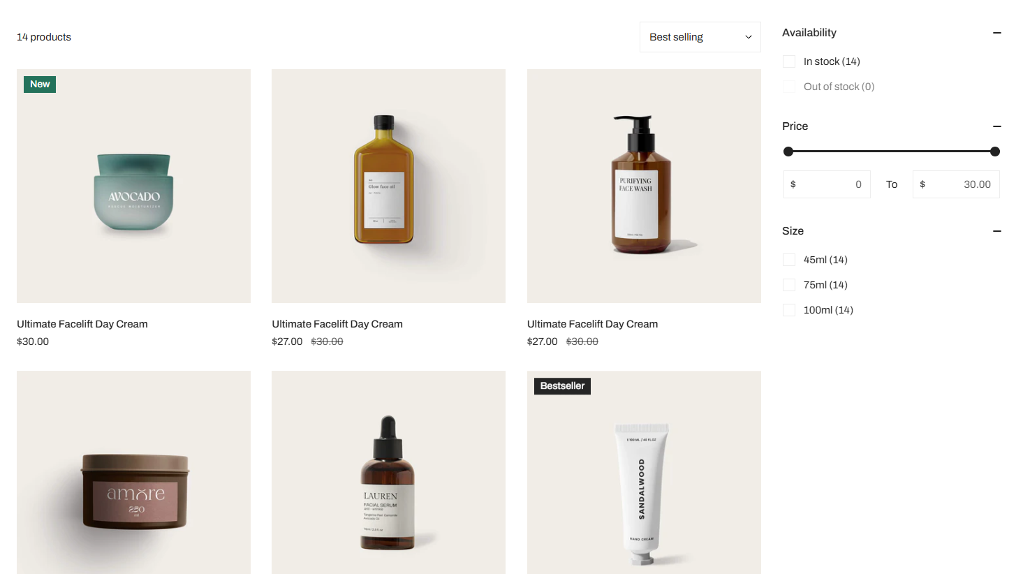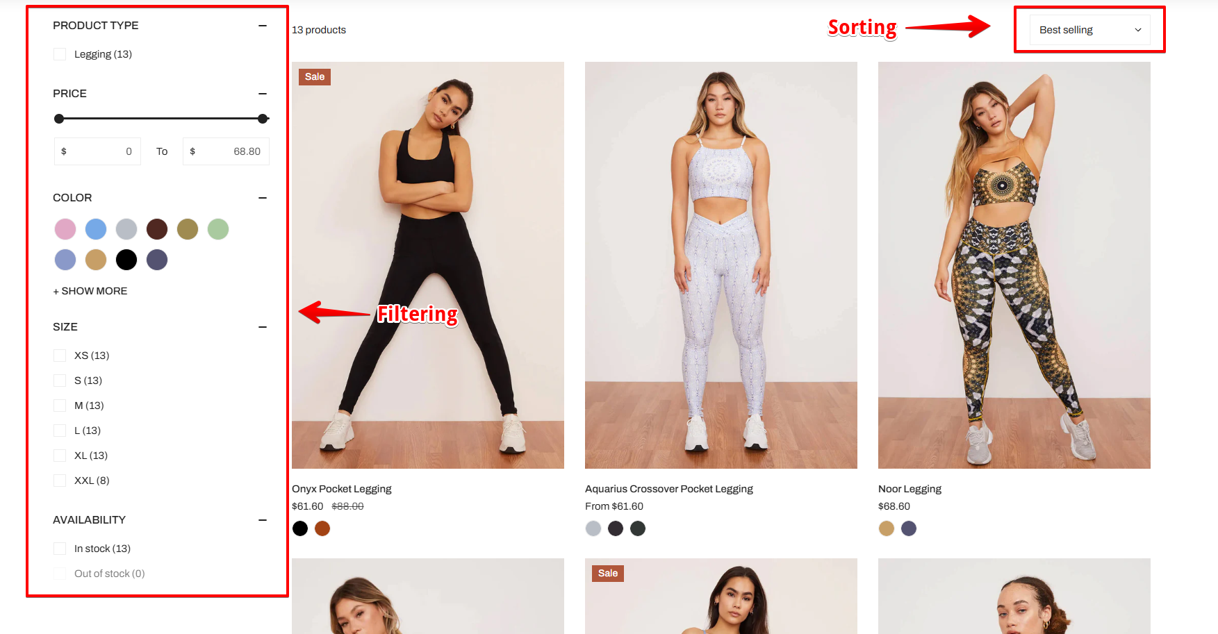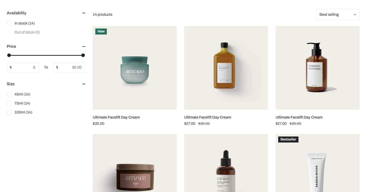 <table><thead><tr><th width="260">Setting</th><th>Description</th></tr></thead><tbody><tr><td><strong>Enable filtering</strong></td><td>Activate Shopify’s storefront filters.<br>Learn <a href="https://help.shopify.com/manual/online-store/storefront-search/search-and-discovery-filters">how to customize filters</a> </td></tr><tr><td><strong>Enable sorting</strong></td><td>Allow sorting by options like price, newest, best-selling, etc.</td></tr><tr><td><strong>Desktop filter layout</strong></td><td><p>Choose:<br>- Left sidebar:<br><img src="https://1836495117-files.gitbook.io/~/files/v0/b/gitbook-x-prod.appspot.com/o/spaces%2FOdebKCa6IK9qfbdvSKj0%2Fuploads%2FZYzLDQw1nSCYLB8WfdLj%2Fimage.png?alt=media&#x26;token=fee2c8a0-efe1-4bcc-a35a-09611f280942" alt=""><br><br>- Right sidebar:</p><p><img src="https://1836495117-files.gitbook.io/~/files/v0/b/gitbook-x-prod.appspot.com/o/spaces%2FOdebKCa6IK9qfbdvSKj0%2Fuploads%2F7B6nuy8bqUd9XOIuoktn%2Fimage.png?alt=media&#x26;token=02637193-0d8b-400e-aa9d-c5bf01e3b54d" alt=""><br><br>- Drawer:<br><img src="https://1836495117-files.gitbook.io/~/files/v0/b/gitbook-x-prod.appspot.com/o/spaces%2FOdebKCa6IK9qfbdvSKj0%2Fuploads%2FnB1G1R538SfqWU6VlbHB%2Fimage.png?alt=media&#x26;token=09426a01-317e-4576-ae22-07e3d4670b4e" alt=""></p></td></tr><tr><td><strong>Group collapsible</strong></td><td>Group filters in collapsible dropdowns.<br><img src="https://1836495117-files.gitbook.io/~/files/v0/b/gitbook-x-prod.appspot.com/o/spaces%2FOdebKCa6IK9qfbdvSKj0%2Fuploads%2FwGYcAo9OhImvEBwiwz91%2Fimage.png?alt=media&#x26;token=3ff78c45-34a4-4f1b-beec-d9d57ba08122" alt=""></td></tr><tr><td><strong>Default state</strong></td><td>Set filters as <code>Collapsed</code> or <code>Expanded</code> on load.</td></tr><tr><td><strong>Open first group by default</strong></td><td>If checked, the first filter group expands on page load.</td></tr><tr><td><strong>Group heading size</strong></td><td>Choose heading font size (Small, Medium, Large).</td></tr><tr><td><strong>Show results count</strong></td><td>Show how many results match the filters.<br><br><img src="https://1836495117-files.gitbook.io/~/files/v0/b/gitbook-x-prod.appspot.com/o/spaces%2FOdebKCa6IK9qfbdvSKj0%2Fuploads%2F7Ep4WLg1tKdvg2EXCsMU%2Fimage.png?alt=media&#x26;token=f3406eb8-ddb0-4774-84a6-3cf0d49acf95" alt=""></td></tr><tr><td><strong>Filter color type</strong></td><td>Choose between <code>Inline</code> color swatches or <code>List</code> view.</td></tr></tbody></table>