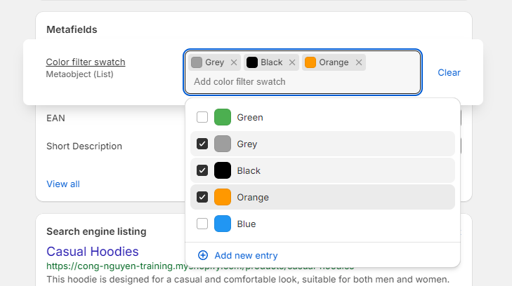 2. In the **Metafields** field, click on the "Color filter swatch" metafield that you've just created above > You will be able to select multiple colors from your list of colors that you defined using metaobjects.