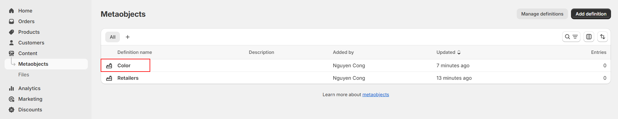 1. In the Shopify admin sidebar, go to the **Content** > **Metaobjects** > In the **Metaobjects** page, select **Color**.