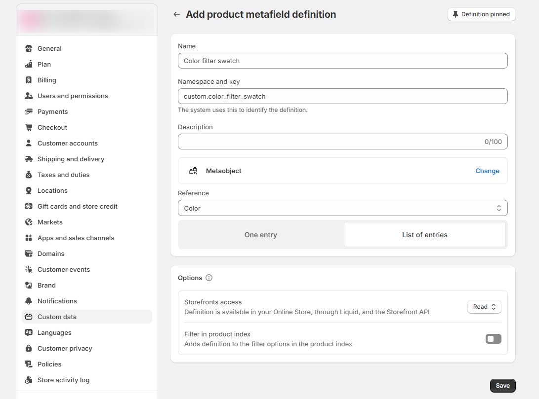 #### After that, we are going to create color [metafields](https://help.shopify.com/en/manual/custom-data/metafields/metafield-definitions/creating-custom-metafield-definitions) for the products to link to these [metaobjects](https://help.shopify.com/en/manual/custom-data/metaobjects/using-metaobjects) that we've just created above: