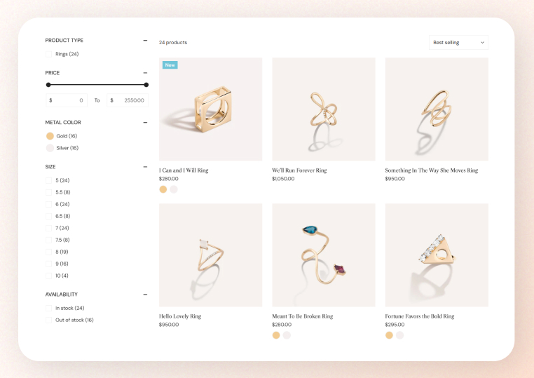 Allow your customers to filter collections and search results by product availability, price, color, and more.&#x20;
