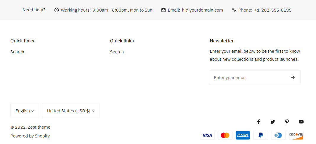 By default, the copyright text includes the copyright symbol, the current year, your store name, and a "Powered by Shopify" link.&#x20;