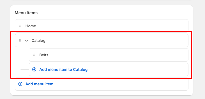 To create a sub‑menu (drop‑down), drag items under a top‑level item and indent.