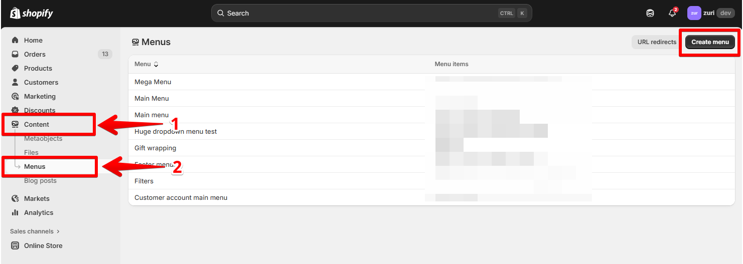 From Shopify admin, navigate to **Content > Menus**.