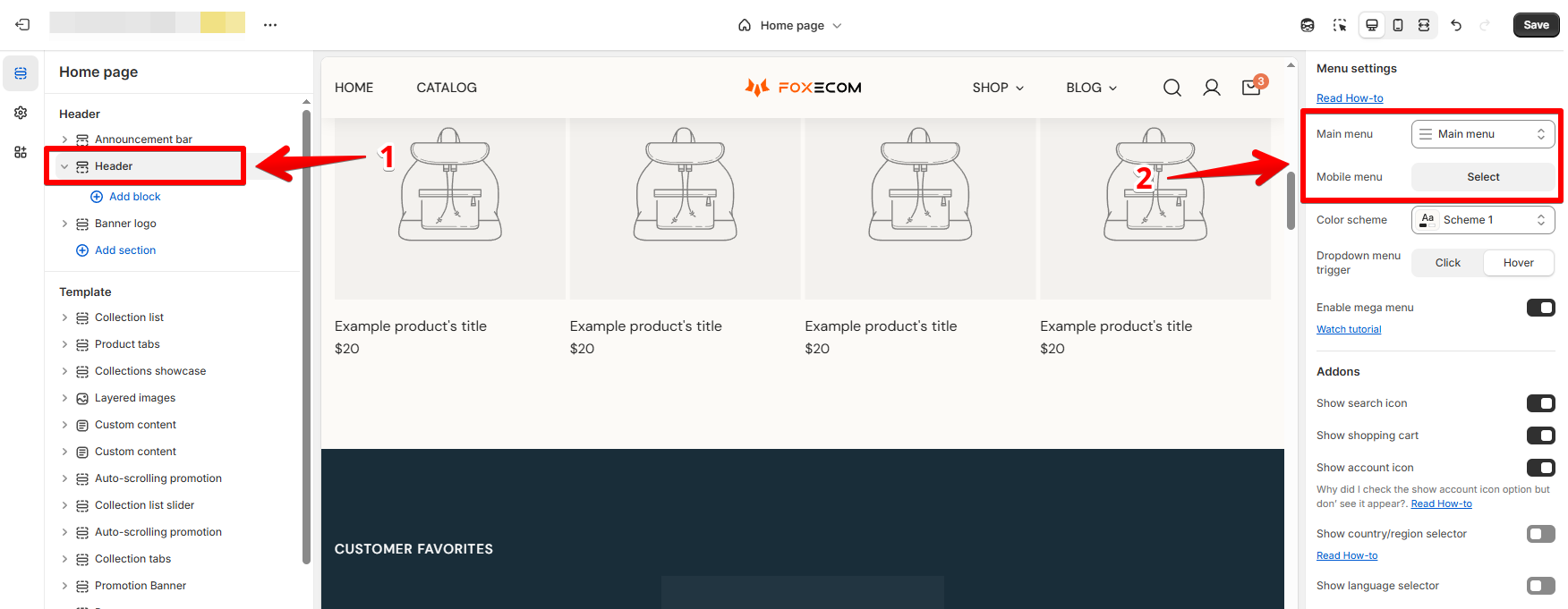3. In the header settings, select which menu to show in the navigation.